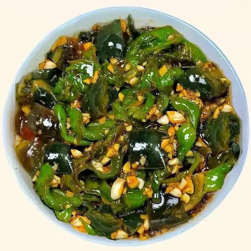 3、皮蛋切碎和尖椒放碗里,倒入酱汁,用锤子捣碎即可!