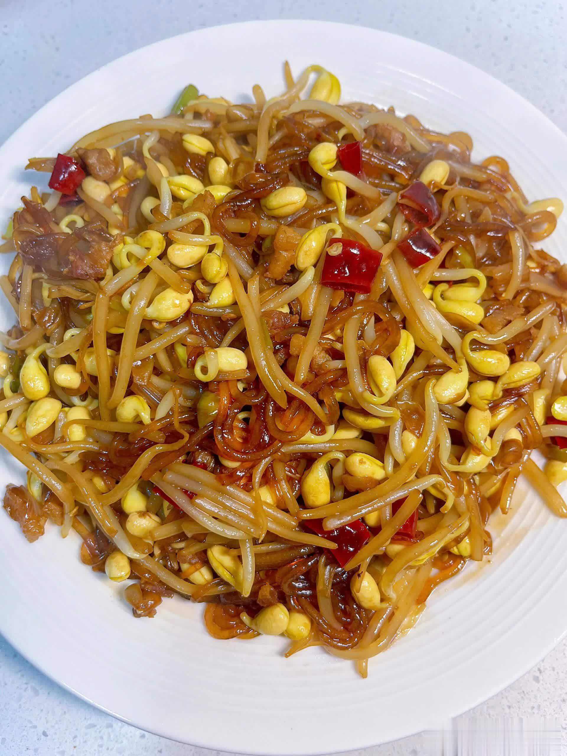 材料:黄芽菜 300 克、粉条 100 克、葱、蒜适量、生抽、盐、食用油适量。