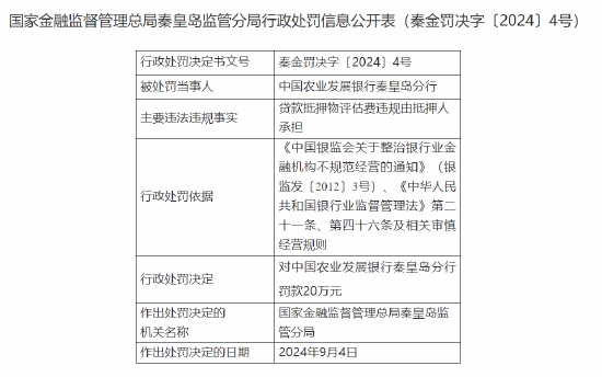9月10日金融一线音书shibo体育游戏app平台,国度金融监督搞定总局秦皇岛监管分局行政处罚信息公开表浮现,中国农业发展银行秦皇岛分行因贷款典质物评估费违章由典质东谈主承担,被罚20万元。